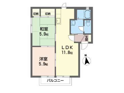 | 詳細間取 | 2LDK (洋5.9帖×1、和5.9帖×1、LDK11.8帖) | ||