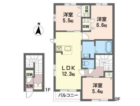 | 詳細間取 | 3LDK (洋6.6帖×1、洋5.5帖×1、5.4帖×1、LDK12.3帖) | ||