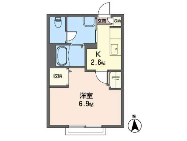 | 詳細間取 | 1K (洋6.9帖×1、キッチン2.6帖) | ||