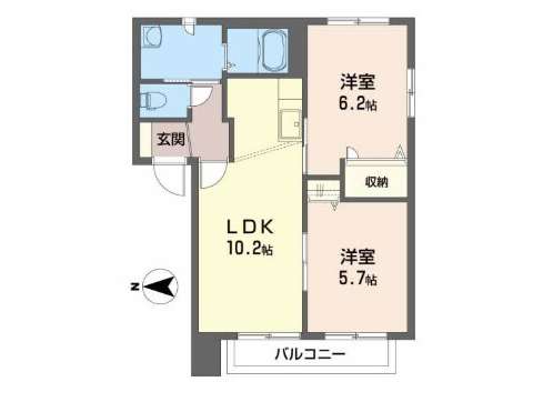 | 詳細間取 | 2LDK (洋6.2帖×1、洋5.7帖×1、LDK10.2帖) | ||